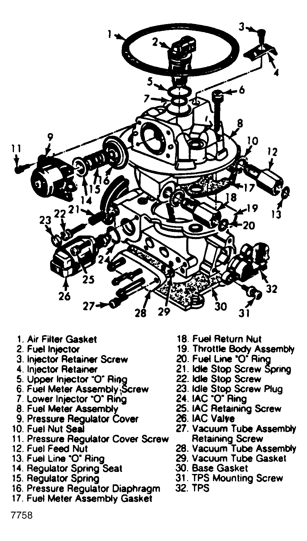 Remove fuel meter-to-throttle body retaining screws. Remove fuel meter assembly. See Fig 1. Discard gasket. If fuel pressure regulator cover is removed, replace regulator diaphragm to prevent fuel leaks. Remove TPS and IAC assembly. Throttle valve screws are staked in position and should not be removed.