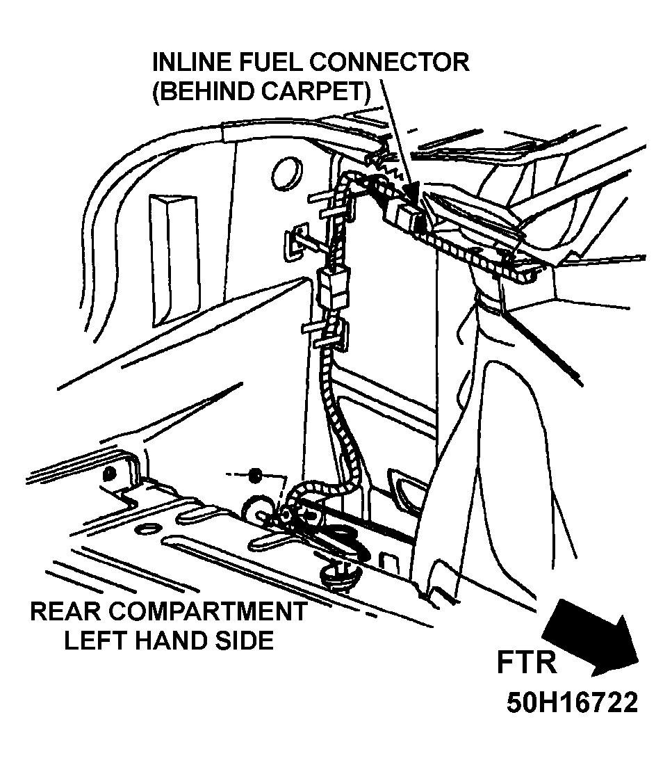 - Apply battery voltage to fuel pump test connector using a 10-amp fused jumper wire. Fuel pump test connector is located in rear compartment on driver's side behind carpet. See Fig 1. Observe fuel pressure reading. If fuel pressure is still not present, check wiring between test connector and fuel pump. If wiring is okay, replace fuel pump.