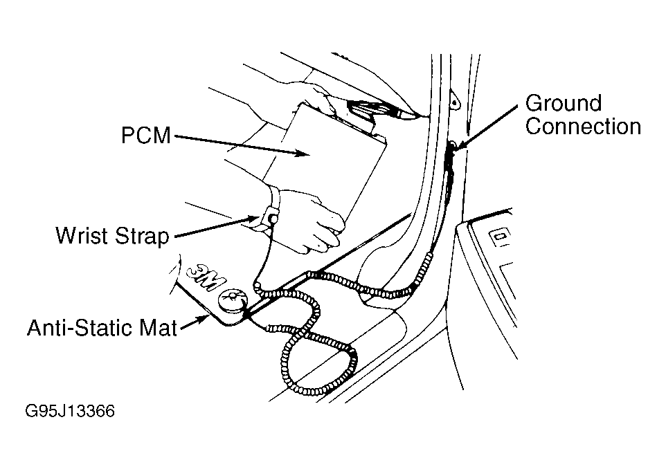 CAUTION: Electronic components used in control systems are designed to carry very low voltages. As little as a 30-volt charge created by static electricity can cause a total or degrading failure in PCM or other electronic components containing integrated circuits. Before servicing PCM, ground yourself and ground work area to discharge stored electricity.