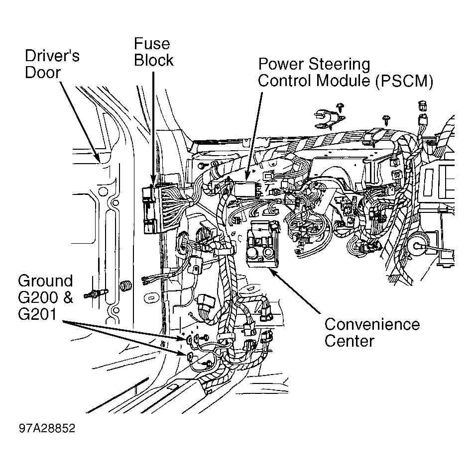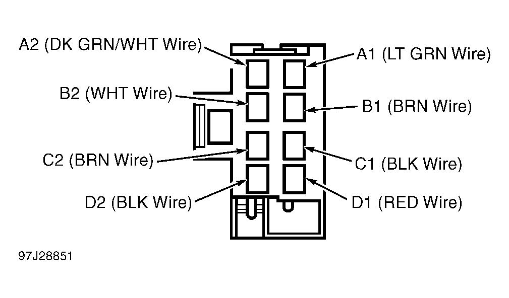 - Remove Dark Green/White wire from terminal A2 on the electrical connector for PSCM. See Fig 2. A jumper wire is to be installed in place of Dark Green/White wire on the electrical connector. Install a electrical connector terminal Part No. 12015870 on a one foot long jumper wire made of 18 guage wire. Install electrical connector terminal on jumper wire in cavity on electrical connector for PSCM.