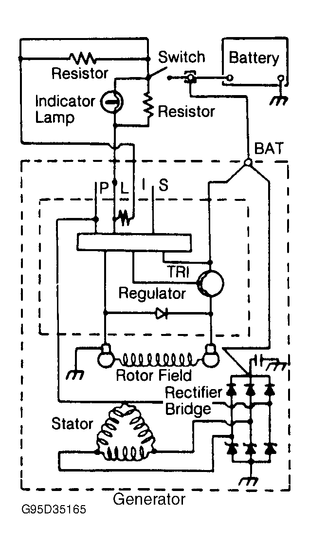 Most CS series generators operate with 2 wire connections and a ground path through the mounting bracket. The first wire connection is the BAT (output) terminal. This terminal must be connected to the battery during operation. The second wire connection is through the charge indicator light or an external resistor to terminal "L" of the regulator. This connection provides initial excitation at start-up.