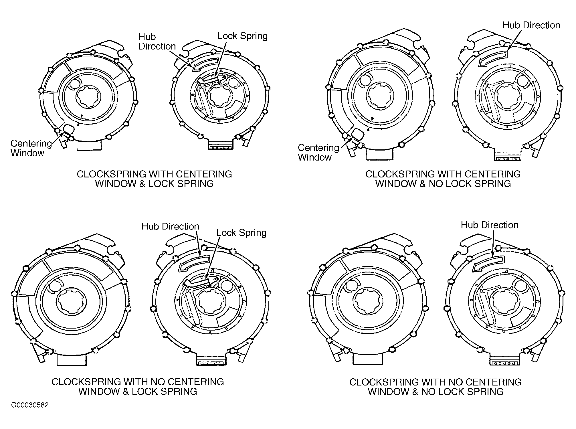 - Rotate clockspring assembly hub in opposite direction slowly until centering window appears yellow and both arrows line up. Release spring lock between locking tabs in front of arrow. See Figure . Clockspring assembly can now be installed if front wheels are in straight-ahead position.