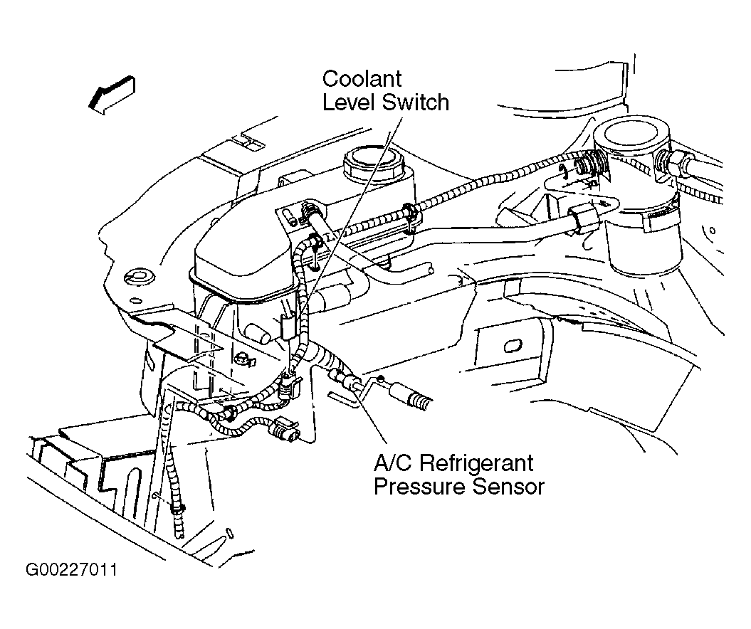 The A/C pressure sensor is a 3 wire piezoelectric pressure transducer located on left side of the engine compartment mounted on the A/C line near the accumulator. See Fig 1 . A 5 volt reference, low reference, and signal circuits enable the sensor to operate. The A/C pressure signal can be between 0-5 volts. When the A/C pressure is low, the signal value is near zero volts. When the A/C pressure is high, the signal value is near 5 volts. The A/C pressure sensor protects the A/C system from operating when an excessively high or low pressure condition exists. The PCM disables the compressor clutch under the following conditions: