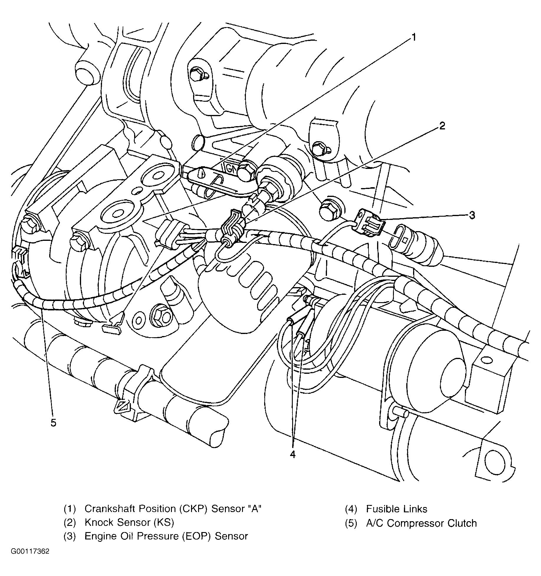 The Knock Sensor (KS) system enables the Powertrain Control Module (PCM) to control the ignition timing advance for the best possible performance while protecting the engine from potentially damaging levels of detonation. The sensors in the KS system are used by the PCM as microphones to listen for abnormal engine noise that may indicate pre-ignition/detonation. Knock sensor is located in the lower rear of the engine block, below the exhaust manifold. See Figure .