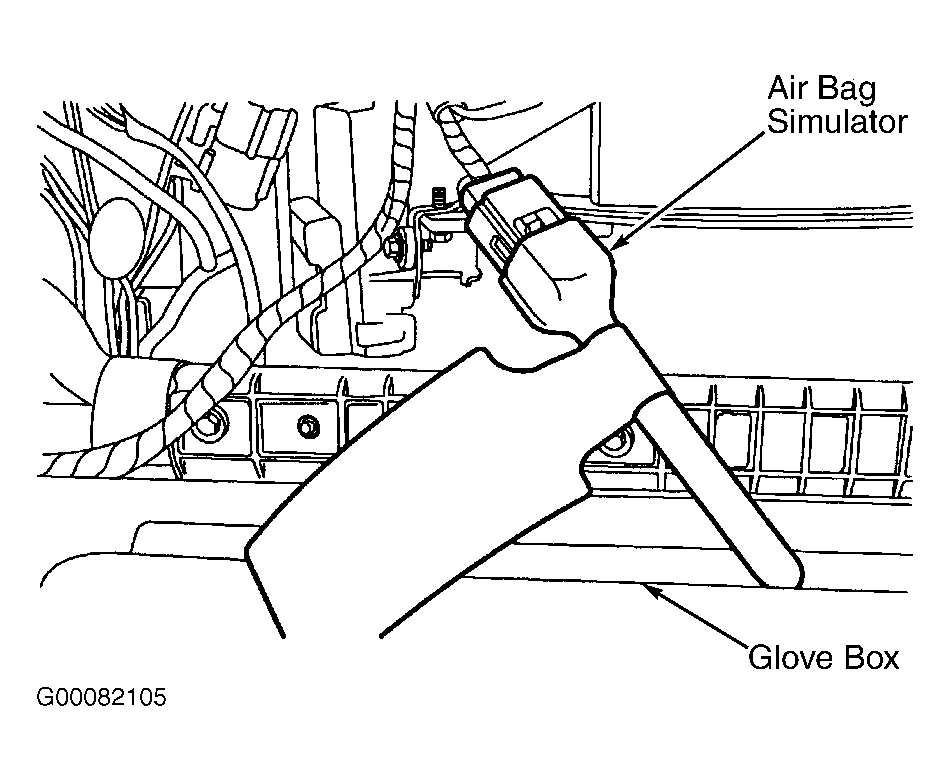 2. Open the glove compartment to its fullest extent by pushing in on the tabs and releasing the glove compartment. Disconnect the passenger air bag module electrical connector. Connect air bag simulator (418-F403) to the harness side of the passenger air bag module electrical connector. See Fig 2. See AIR BAG SIMULATOR .