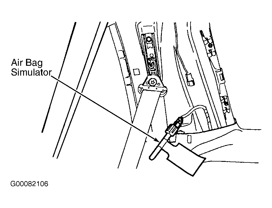 3. Separate the passenger side "C" pillar trim panel. Disconnect the passenger side safety canopy module electrical connector, located on the "C" pillar behind the second row safety belt shoulder height adjuster. Connect air bag simulator (418-F088/105-R0012) to the vehicle harness side of the passenger side safety canopy module electrical connector. See Fig 3. See AIR BAG SIMULATOR .