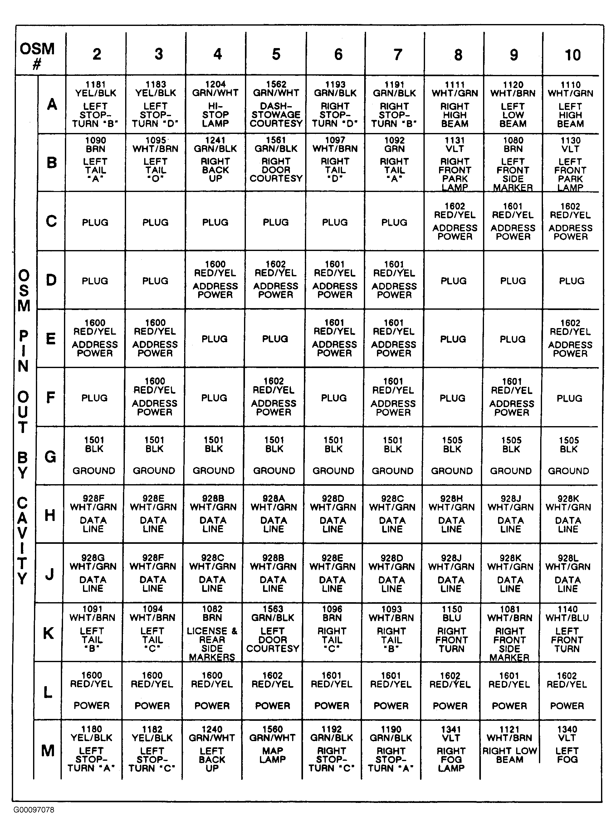 Each OSM is equipped with address pins connected through the vehicle's wiring harness. These address pins allow the BCM to determine which OSM it is monitoring as it scans the lighting system. The address is determined by pins "C", "D", "E" and "F". Each OSM will have these 4 pins connected in a combination that is unique to the lighting function the OSM is located at.
