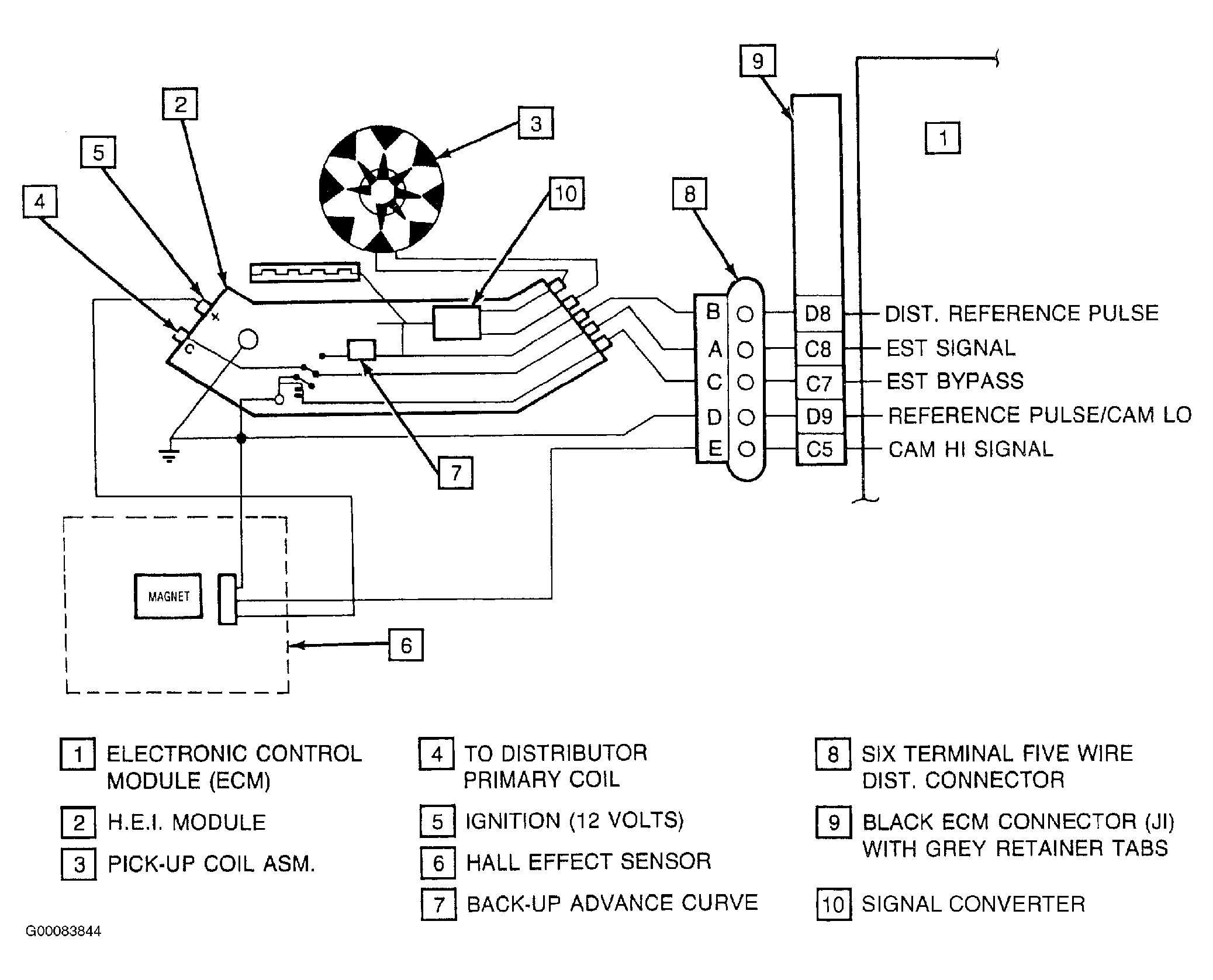 The EST system consists of distributor module, ECM, and connecting wires. The distributor has four wires that connect HEI module to ECM. The connector terminals are lettered as shown. See Fig 1 . These circuits perform following functions: