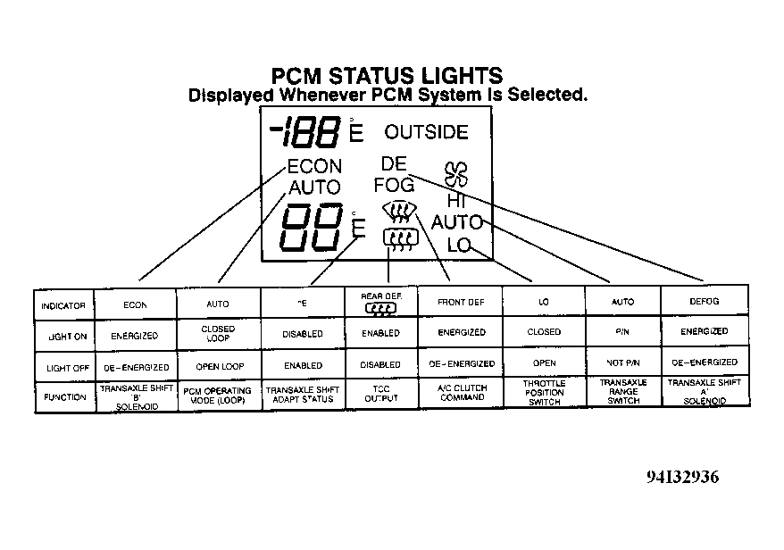 PCM OUTPUTS option provides ability to cycle PCM-controlled outputs. DIC display identifies solenoid or relay and state PCM is commanding that device. HI indicates solenoid or relay is de-energized and LO indicates solenoid or relay is energized. See Figure .