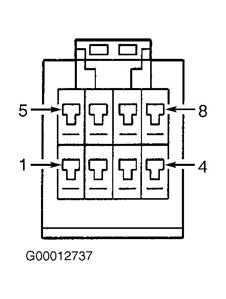 2. Disconnect 8-pin Passenger Door Module (PDM) connector C4. Using DVOM, measure resistance of mirror vertical drive motor circuits between PDM C4 connector terminals No. 1 (Yellow wire) and No. 5 (Light Green wire). See Fig 1 . If reading is 2-8 ohms, go to step  7 . If reading is not 2-8 ohms, go to next step.