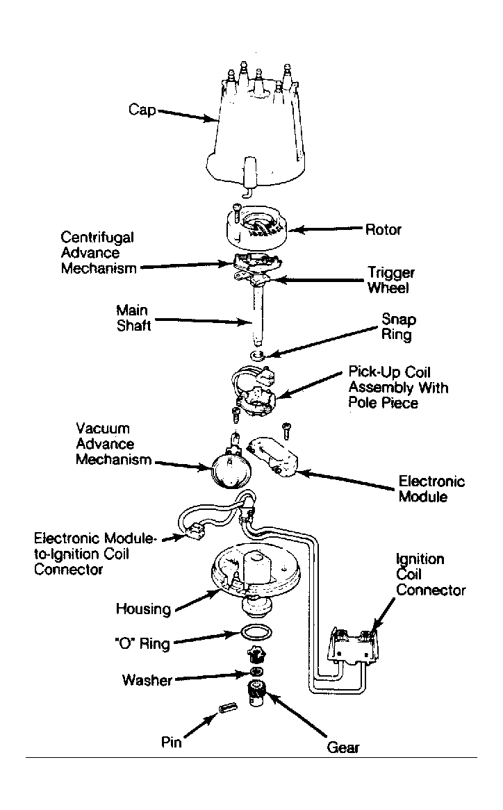 The HEI distributor housing encloses the following components: Vacuum and centrifugal advance mechanisms, magnetic pick-up coil, pole piece (with internal teeth), trigger wheel (with external teeth), an electronic module (with built-in radio noise suppression capacitor), rotor and distributor shaft. See Fig 1.