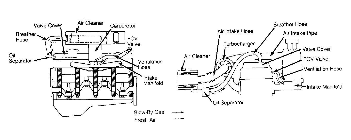 Closed crankcase ventilation systems usually consist of one or more of the following: PCV valve, oil separator, blow-by filter and connecting hoses. For illustration of typical PCV systems, see Figure .
