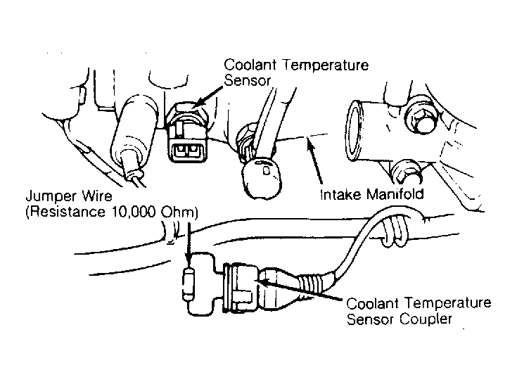 - Increase engine speed to 3000 RPM and quickly release accelerator pedal. Air should be drawn into hose. Disconnect coolant temperature connector. Connect a 10,000 ohm resistance jumper wire. See Fig 1