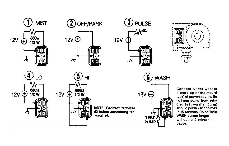 hold WASH button longer than 15 seconds in each 2 minute interval. If wiper motor fails to operate in all modes, replace wiper motor.