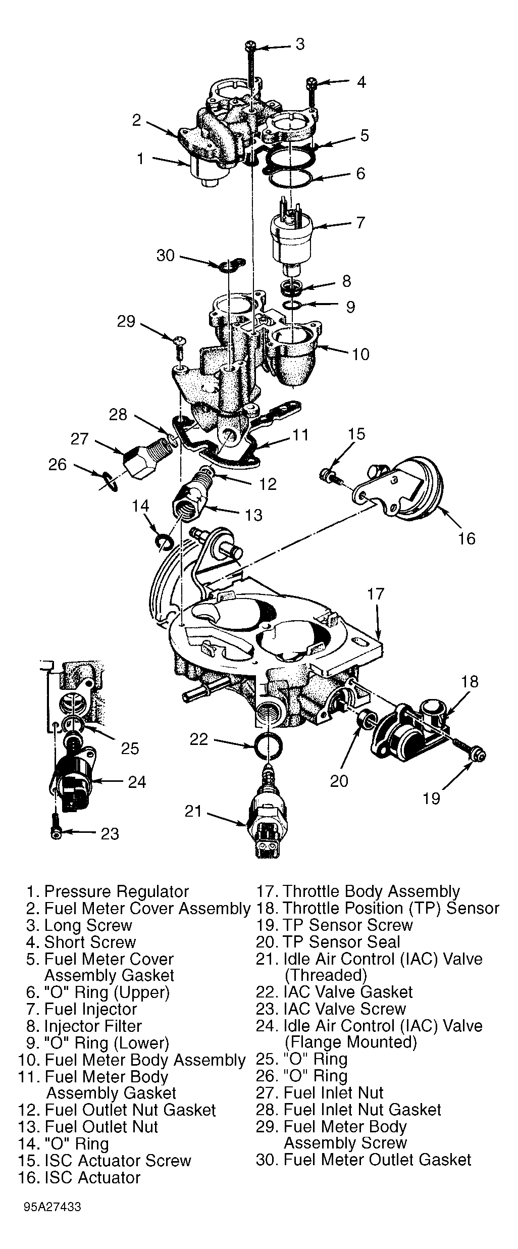 - Remove fuel injectors. Note location of fuel inlet and outlet nuts and remove. Discard gaskets. Remove fuel meter body assembly-to-throttle body screws. See Fig 1. Remove fuel meter body assembly. Remove and discard fuel meter body assembly gasket and fuel meter outlet gasket.