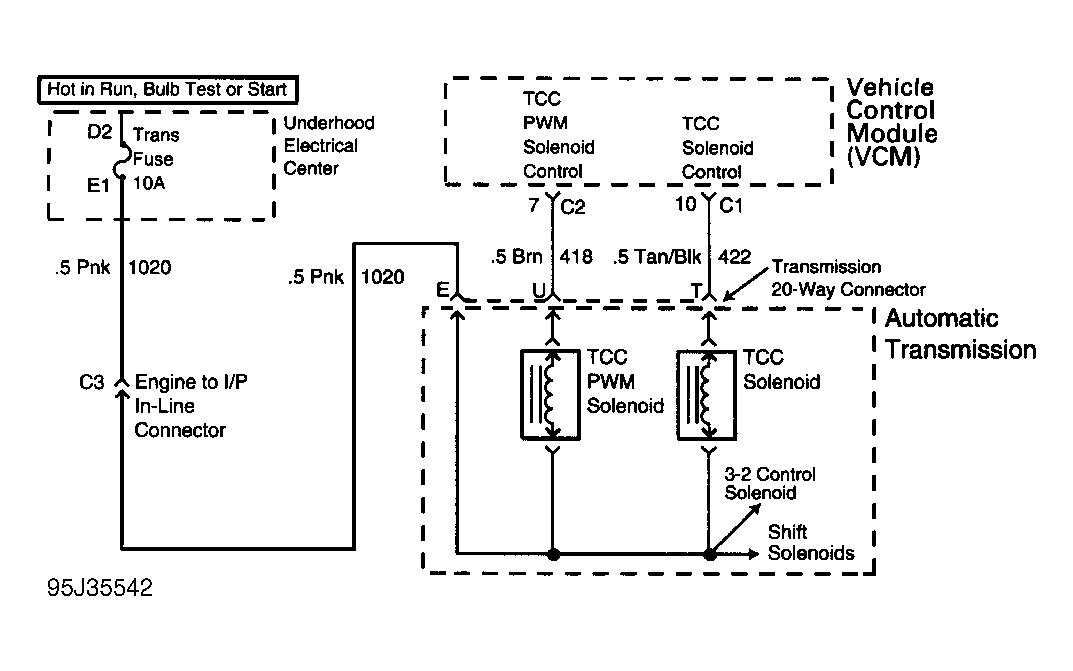 - Connect a test light to battery voltage. Touch TCC control driver terminal with test light. See Figure . Accelerate vehicle to 45 MPH and note test light. If test light does not illuminate, problem is a faulty PCM/VCM connector or PCM/VCM. On some models, lock-up signal may be checked at Data Link Connector (DLC) terminal "F" instead of at PCM/VCM terminal.