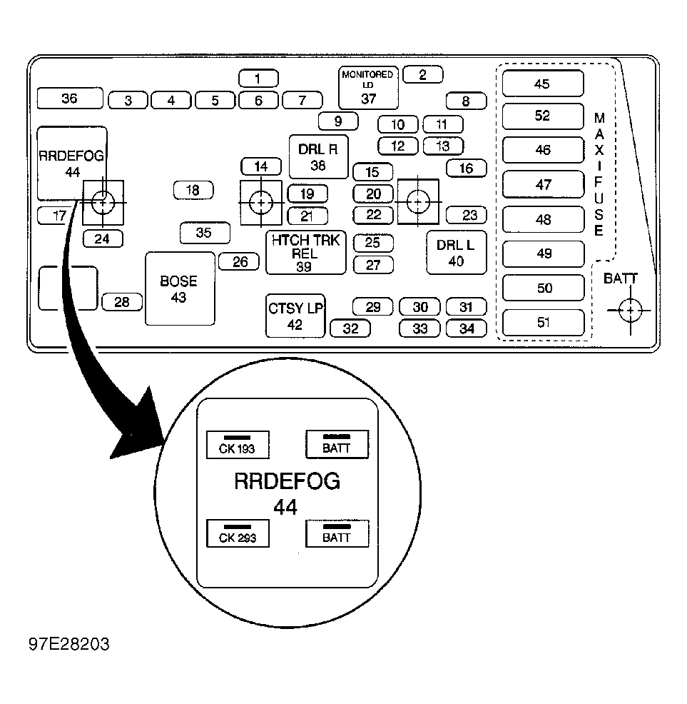 - Turn ignition off. Disconnect rear defogger relay from instrument panel electrical center. Turn ignition on. Using a test light connected to ground, probe rear defogger relay BATT terminals at instrument panel electrical center. See Figure . If test light illuminates, go to next step. If test light does not illuminate, go to step 14).