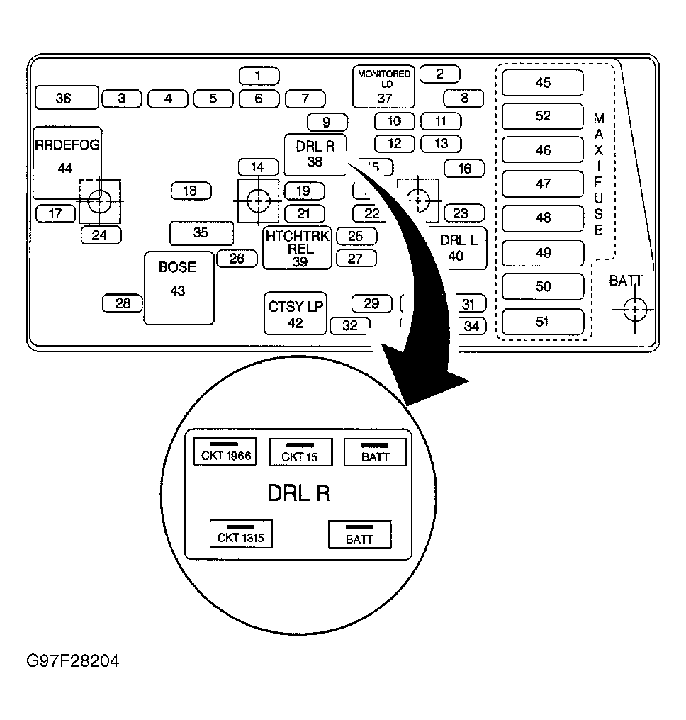 - Turn ignition off. Disconnect RH DRL relay from instrument panel electrical center. Turn ignition on. Using a test light connected to ground, probe RH DRL relay BATT terminals at instrument panel electrical center. See Figure . If test light illuminates, go to next step. If test light does not illuminate, go to step 13).