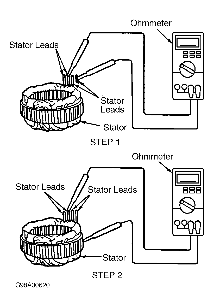 1. Using an ohmmeter, measure resistance between stator leads. Perform STEP 1. See Fig 1. If resistance is more than 5 ohms for any measurement, replace stator.