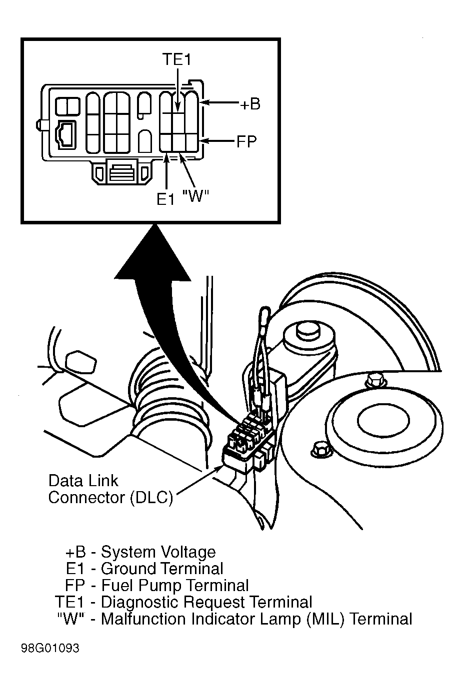 - Connect timing light according to manufacturer's instructions. Connect a fused jumper wire between terminals E1 and TE1 of Data Link Connector (DLC) in engine compartment. See Figure . Start engine and aim timing light at timing mark. Notch on crankshaft pulley should align at 8-10 degrees BTDC on timing indicator at each flash of timing light.