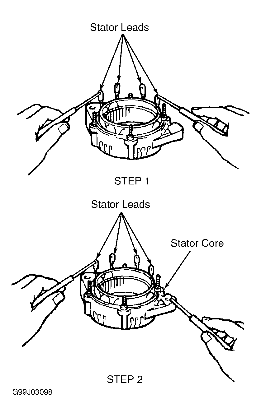 - Using an ohmmeter, measure resistance between each stator lead and stator core. Perform STEP 2. See Fig 1 . If resistance is less than 5 ohms, replace stator.