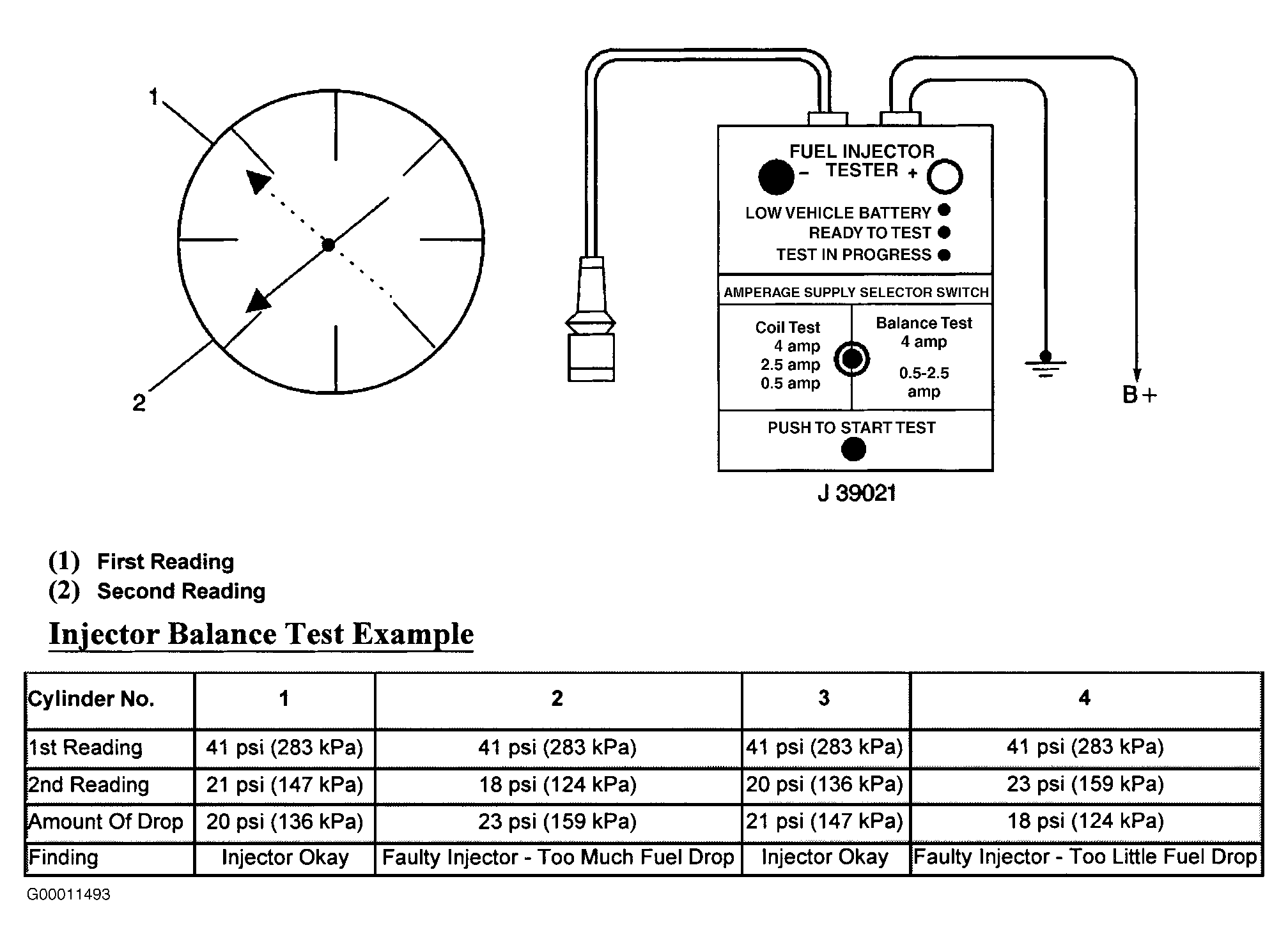 4. - The fuel injectors are flowing properly if pressure drop value for each fuel injector is within 1.5 psi (10.0 kPa) of average pressure drop value. Calculate pressure drop value for each fuel injector by subtracting second pressure reading from first pressure reading. See Fig 1.