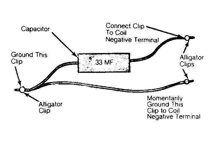 2. Remove coil secondary wire from distributor cap and hold 1/4" from a good ground. Prepare a special jumper wire assembly as shown in Fig 1 . With ignition switch on, momentarily touch special jumper wire to ground and coil negative terminal. A spark should be obtained at secondary wire.