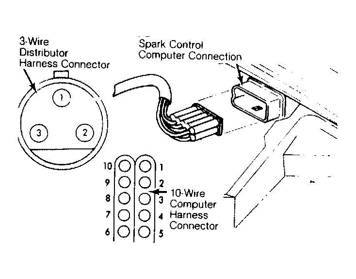 3. If spark was obtained, proceed to step 6). If no spark resulted, turn ignition off and disconnect 10-wire harness connector from computer. See Fig 2 . Turn ignition back on and again, using special jumper wire, connect negative terminal momentarily to ground. Spark should be obtained.