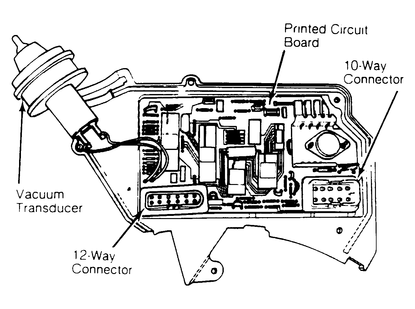 The computer is mounted on the air cleaner housing. It consists of a printed circuit board which simultaneously receives signals from all data sensors and analyzes these signals to determine spark advance and air/fuel mixture. See Figure . Incorporated within the computer are the electronics for the throttle control, EGR and air switching systems. After determining spark advance, the computer will operate the engine in one of the following modes: