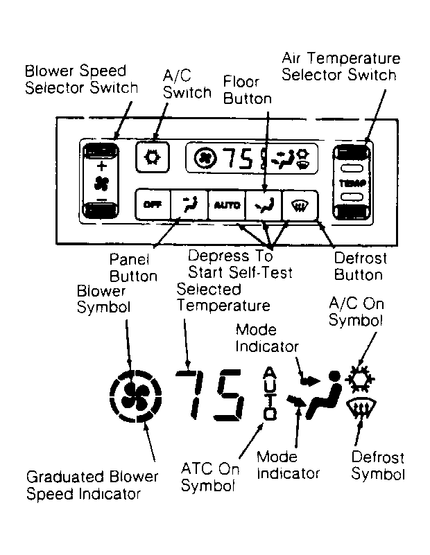 When button is depressed, airflow is routed to defroster vents. Some airflow is also routed to floor outlets. A/C compressor will operate in this mode when temperature is greater than 30°F (-1°C). Control panel will display defrost symbol. See Figure.