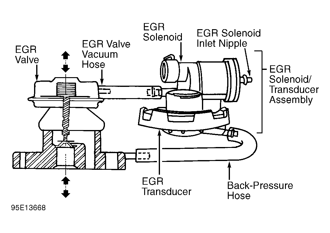 - Disconnect backpressure hose from EGR transducer. See Fig 1 . Connect a hand-held vacuum pump to EGR transducer bottom nipple. Apply 10 in. Hg vacuum. If vacuum holds, go to next step. If vacuum does not hold, replace EGR valve and EGR solenoid/transducer assembly. EGR valve and EGR solenoid/transducer assembly must be replaced together because they are calibrated to match each other.