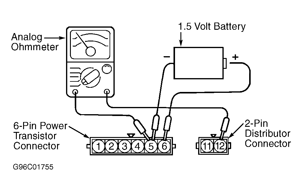 - Turn ignition off. Disconnect 6-pin power transistor connector. Disconnect 2-pin distributor connector. Using a jumper wire, connect negative terminal of a 1.5 volt battery to 6-pin power transistor connector terminal No. 5 (Black wire).