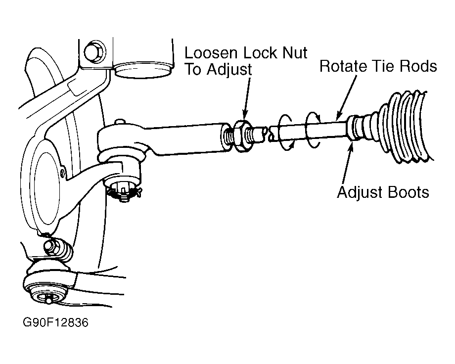 With steering wheel centered, loosen tie rod end lock nuts or pink bolt. While holding steering rod dust boots stationary, rotate tie rods or tie rod adjustment sleeve to obtain specified toe-in. See WHEEL ALIGNMENT SPECIFICATIONS . See Fig 1. Tighten lock nuts to specification. See TORQUE SPECIFICATIONS .
