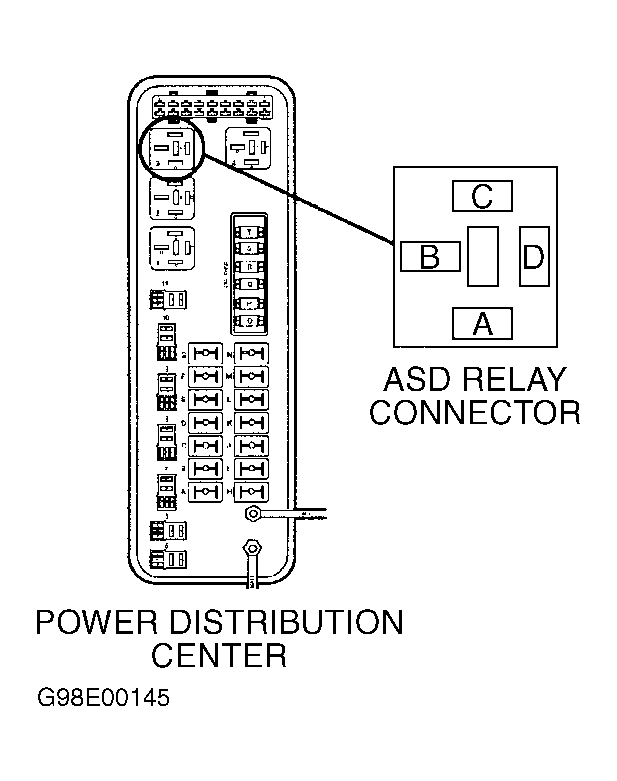 3. Measure voltage between ground and terminals "A" (Red/White wire) and "B" (Red/White wire) at ASD relay socket in PDC. See Figure. If voltage is more than 10 volts at both terminals, go to next step. If voltage is 10 volts or less at any terminal, check for open in Red/White wire between ASD relay and PDC. Repair wiring as necessary. Also check fuse "N" (30-amp) in PDC. Replace fuse as necessary.