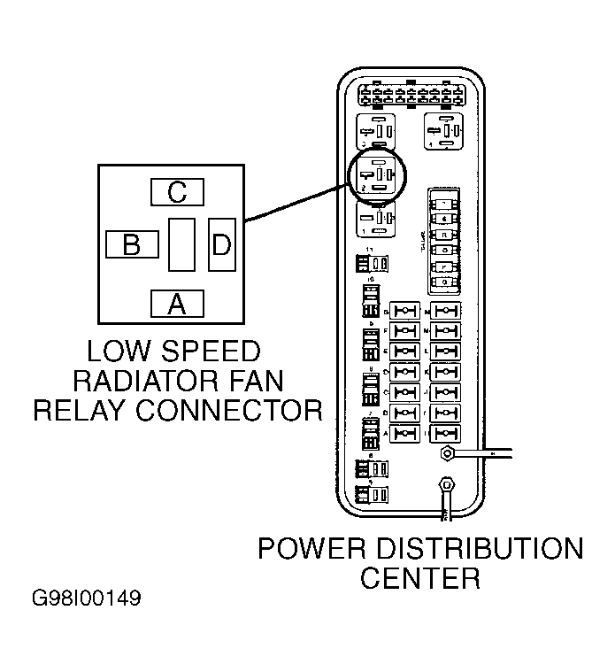 1. Turn ignition on. Using scan tool, actuate low speed radiator fan relay. Locate low speed radiator fan relay in Power Distribution Center (PDC). See Fig 1. If low speed radiator fan relay cycles on and off, go to next step. If low speed radiator fan relay does not cycle on and off, stop relay actuation and go to step  4.