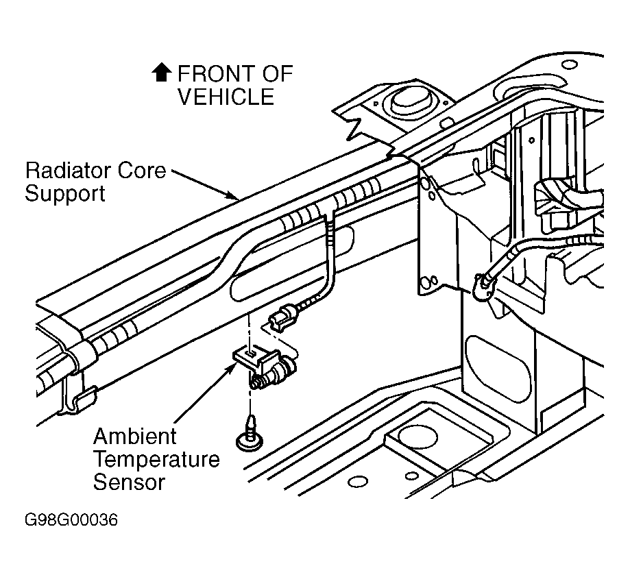 - Turn ignition off. Visually inspect related connectors and wiring harness for damage. Ambient temperature sensor is located on bottom of upper radiator support and may be difficult to access. See Figure. Repair connectors and wiring harness as necessary. If connectors and wiring harness are okay, reconnect all connectors and go to next step.