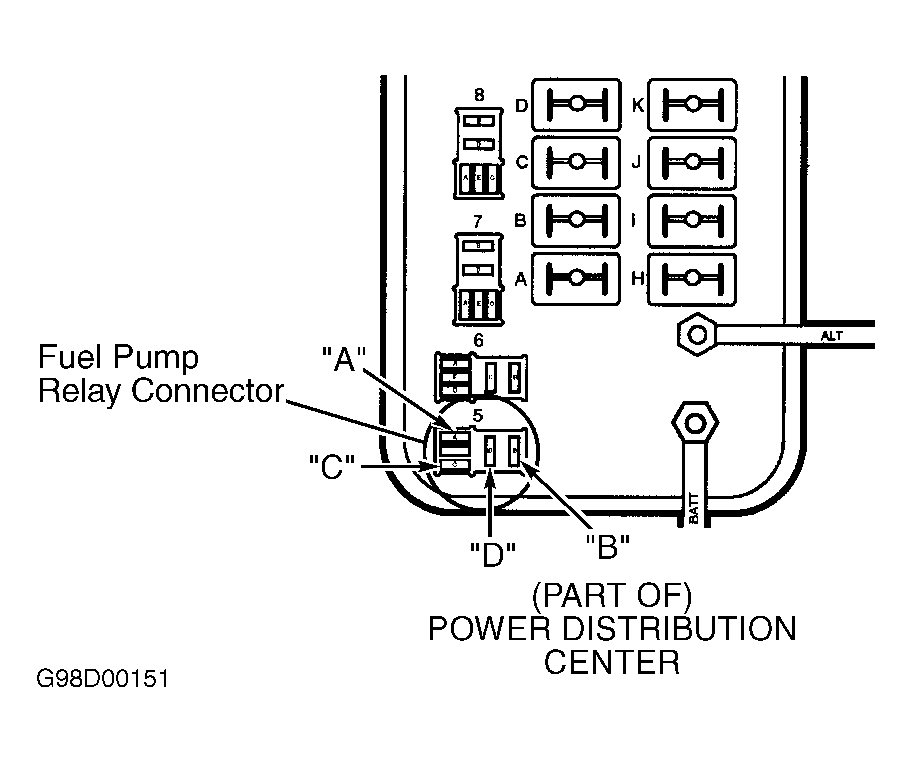 - Remove fuel pump relay from PDC. Turn ignition on. Measure voltage between ground and terminal "B" (Red wire) at fuel pump relay socket in PDC. See Fig 1. If voltage is more than 10 volts, go to next step. If voltage is 10 volts or less, Check for open in fused ignition switch output circuit (Red wire) between fuel pump relay and PDC. Repair wiring as necessary. Also check fuse "G" (40-amp) in PDC. Replace fuse as necessary.