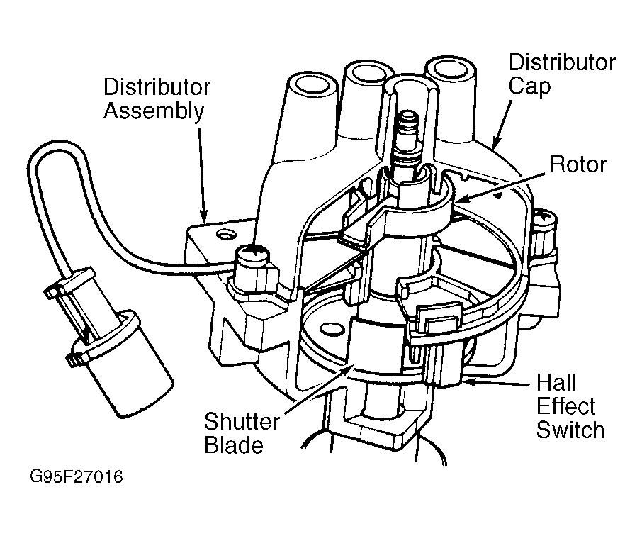 On models equipped with a distributor, CMP sensor is made up of a Hall Effect switch (sync signal generator) and a rotating pulse ring (shutter) on distributor shaft. See Fig 1 . On Distributorless Ignition System (DIS), CMP sensor reads slots in cam timing sprocket. PCM uses this information along with information from Crankshaft Position (CKP) sensor to determine if fuel injectors and ignition coils are properly sequenced for correct cylinders.