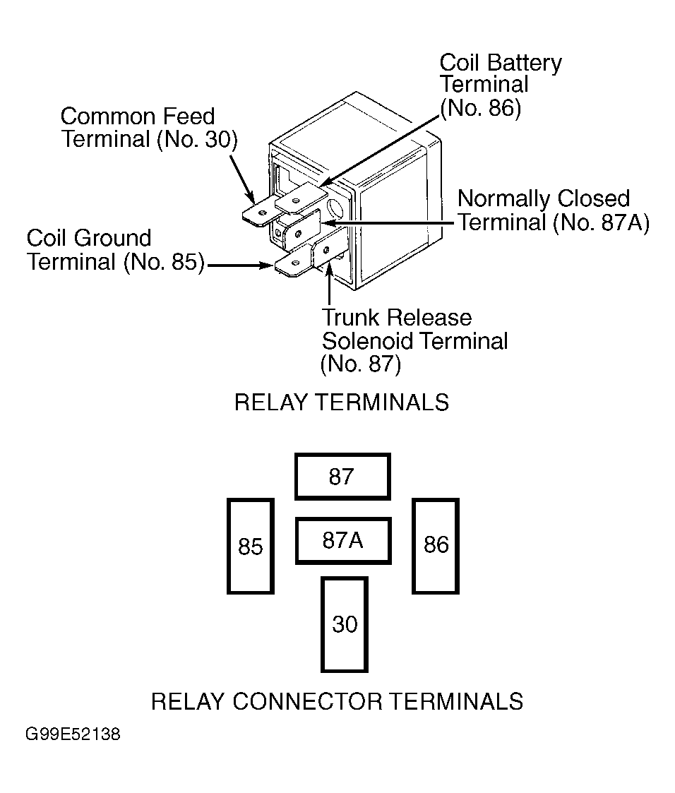- Connect 12-volt power source to relay terminal No. 86, and ground terminal No. 85. Continuity should exist between terminals No. 30 and 87. No continuity should exist between terminals No. 30 and 87A. If continuity is not as specified, replace relay. If continuity is as specified, relay is okay. Go to TRUNK RELEASE RELAY CIRCUIT TEST under CIRCUIT TESTS.