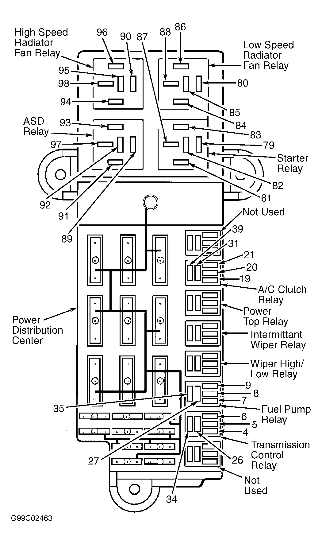 - Note identification of cavities in power distribution center for ASD relay. See Fig 1 . Using ohmmeter, check resistance between cavity No. 93 (Dark Blue/Violet wire) in power distribution center for ASD relay and terminal No. 67 (Dark Blue/Violet wire) on PCM connector C2. If resistance is less than 5 ohms, go to next step. If resistance is 5 ohms or more, repair open on Dark Blue/Violet wire between PCM and cavity No. 93 in power distribution center for ASD relay. Perform TEST VER-2A .