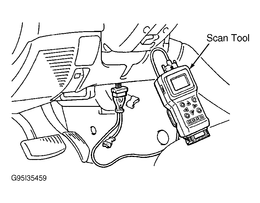 1. Ensure ignition is off. Connect scan tool to 16-pin Data Link Connector (DLC). DLC is located under instrument panel, to right of steering column. See Fig 1 . Close both doors. Turn ignition switch to ACC position, then turn back to LOCK position.