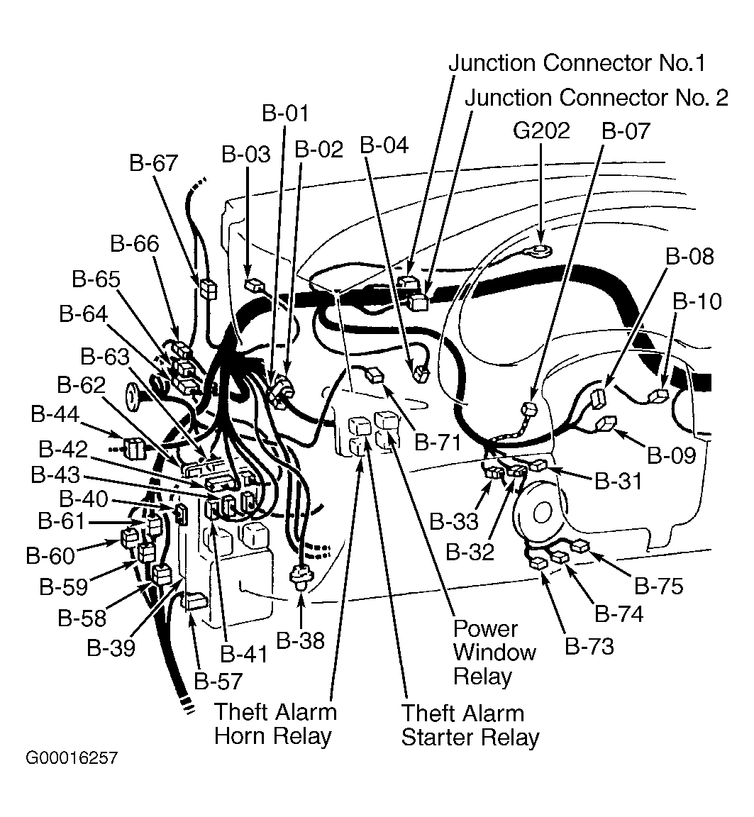 2. Check continuity between ground and terminals No. 4 (Black wire) and No. 5 (Black/White wire) at 16-pin DLC. If continuity is present at both terminals, check for loose scan tool cable connections or bad cable. If cable connections or cable are defective, repair or replace components as necessary. If cable connections and cable are okay, replace scan tool. If continuity is not present at either terminal, repair open in Black wire or Black/White wire between DLC and ground connection G202. Ground is located behind left side of instrument panel. See Figure.