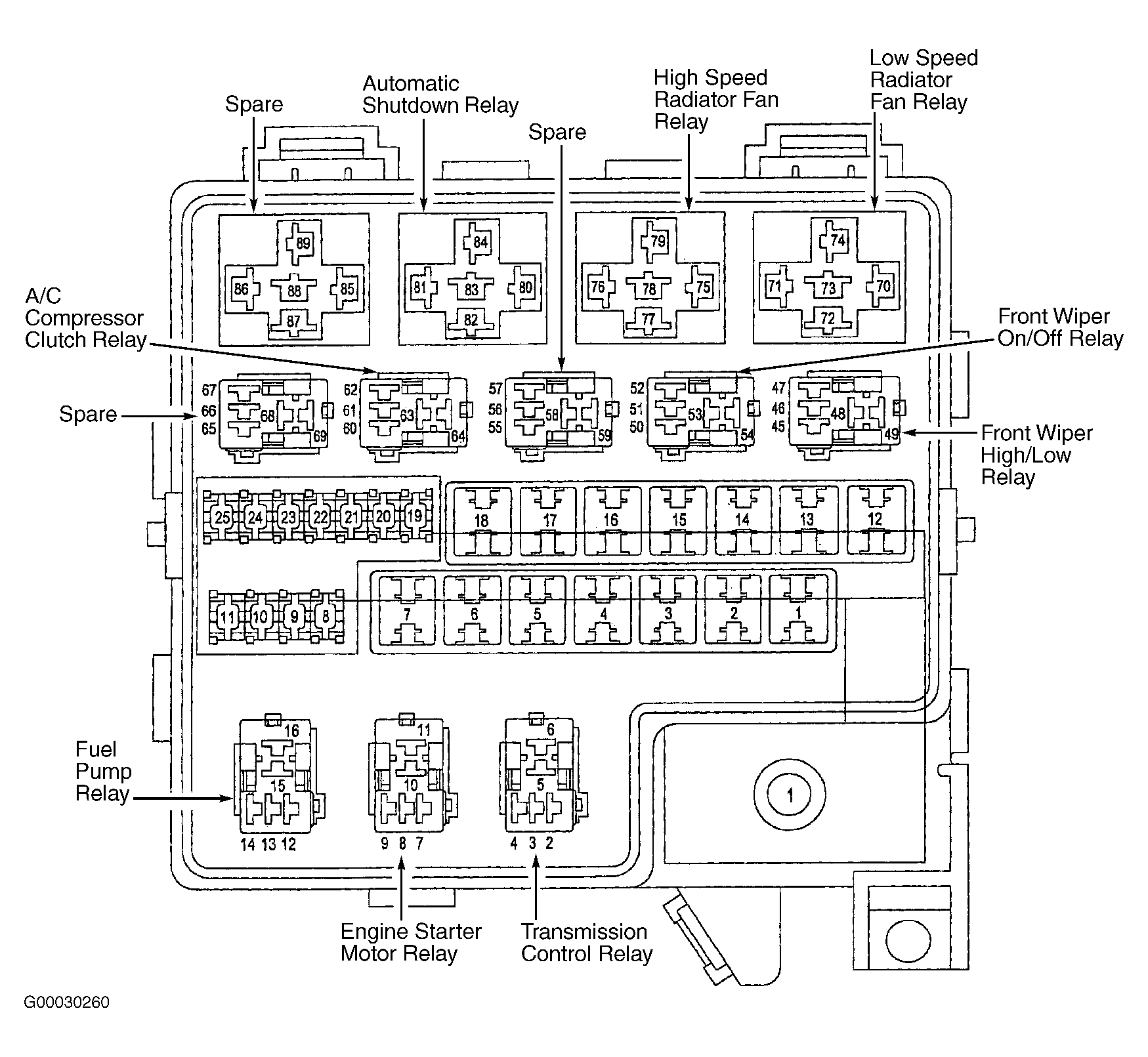 4. Turn ignition off. Remove appropriate radiator fan relay from Power Distribution Center (PDC). PDC is located in engine compartment. See Figure . Connect a test light between ground and fused battery voltage circuit (Red/Light Green wire) at low speed radiator fan relay harness connector terminal No. 74 or high speed radiator fan relay harness connector terminal No. 79. See Figure . If test light illuminates brightly, go to next step. If test light does not illuminate brightly, repair open or short in fused battery voltage circuit.