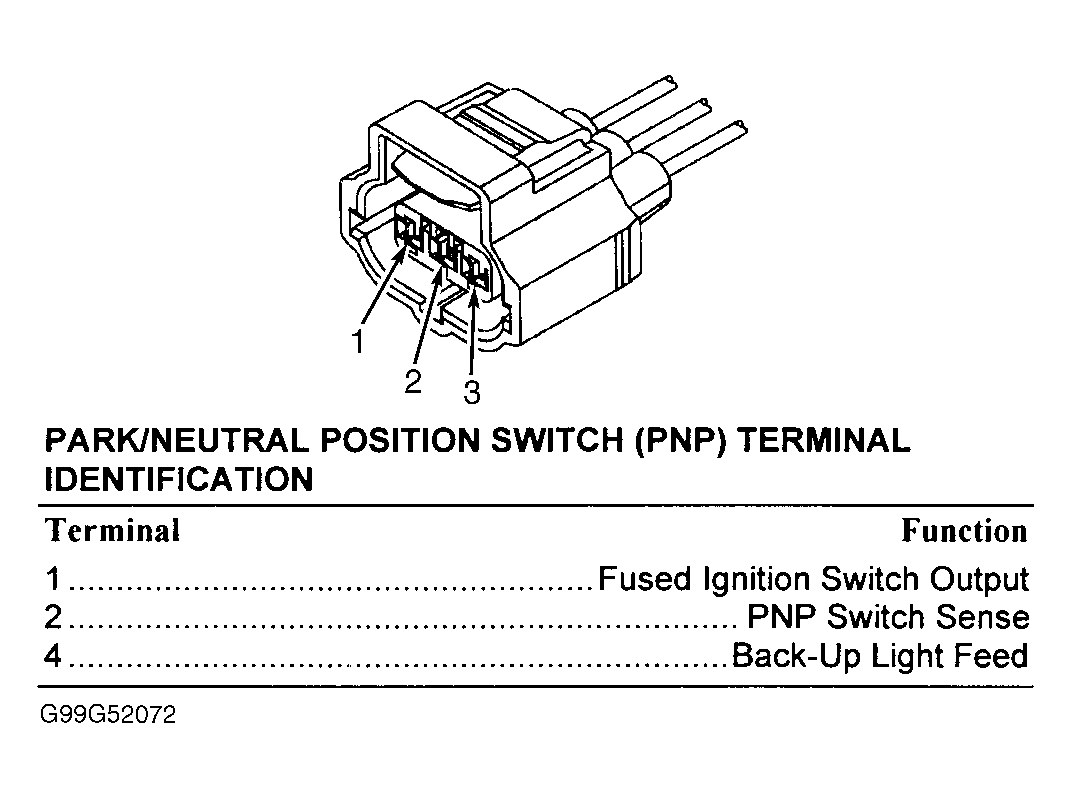 2. Place gear selector in Reverse. Check continuity between ground and PNP switch center terminal. If continuity does not exist, PNP switch is okay. If continuity exists, replace PNP switch.