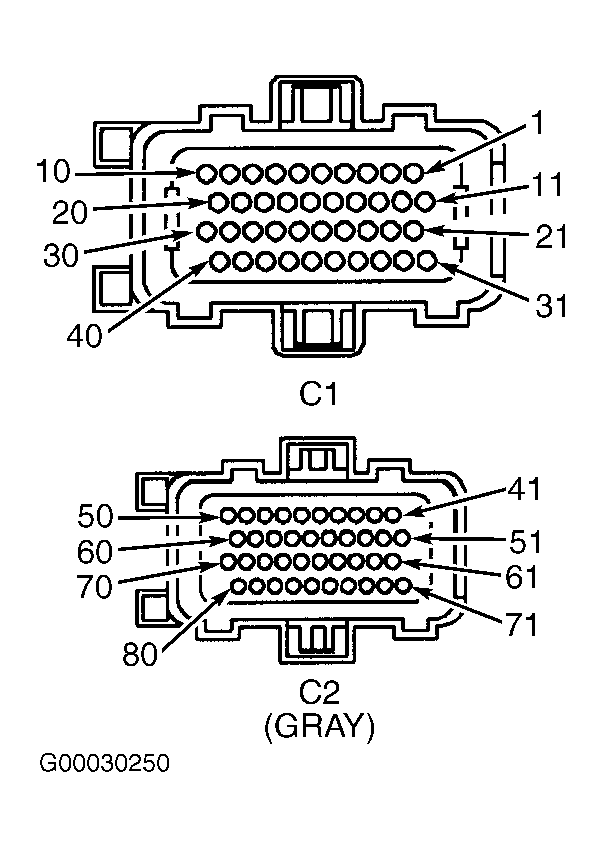3. Measure voltage drop in 1/1 HO2S signal circuit (Black/Dark Green wire) by backprobing between 1/1 HO2S connector and terminal No. 30 at PCM C1 connector. See Figure and Figure . If voltage drop is less than .1 volt, go to next step. If voltage drop is .1 volt or more, repair high resistance in Black/Dark Green wire.