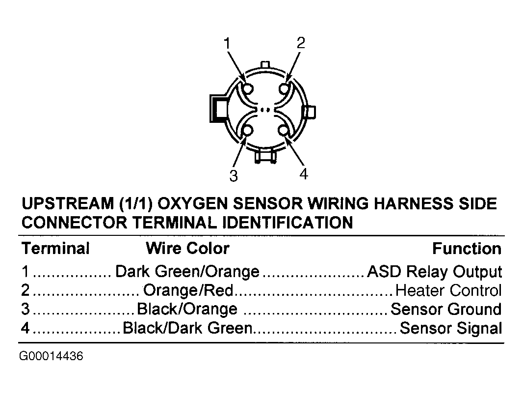 - Turn ignition off. Reconnect PCM harness connectors. Ensure 1/1 HO2S is still disconnected. Using scan tool, actuate O2 HEATER TEST. Measure voltage between ground and ASD relay output circuit (Dark Green/Orange wire) at 1/1 HO2S harness connector. If voltage is more than 11 volts, go to next step. If voltage is 11 volts or less, repair open in ASD relay output circuit.