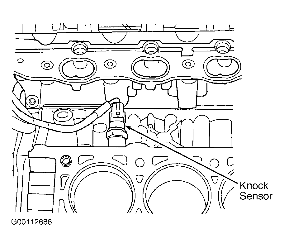The knock sensor is located on cylinder block, below lower intake manifold. See Fig 1 or Fig 2 . On all models, the knock sensor is designed to detect engine vibration that is caused by detonation. When the knock sensor detects a knock in one of the cylinders, it sends an input signal to the PCM. In response, the PCM retards ignition timing for all cylinders by a scheduled amount. Knock sensors contain a piezoelectric material which constantly vibrates and sends an input voltage signal to the PCM while the engine operates. As the intensity of the crystal's vibration increases, the knock sensor output voltage also increases. The voltage signal produced by the knock sensor increases with the amplitude of vibration. The PCM receives the knock sensor voltage signal as an input. If the signal increases above a predetermined level, the PCM will store that value in memory and retard ignition timing to reduce engine knock. If the knock sensor voltage exceeds a preset value, the PCM retards ignition timing for all cylinders. It is not a selective cylinder retard.