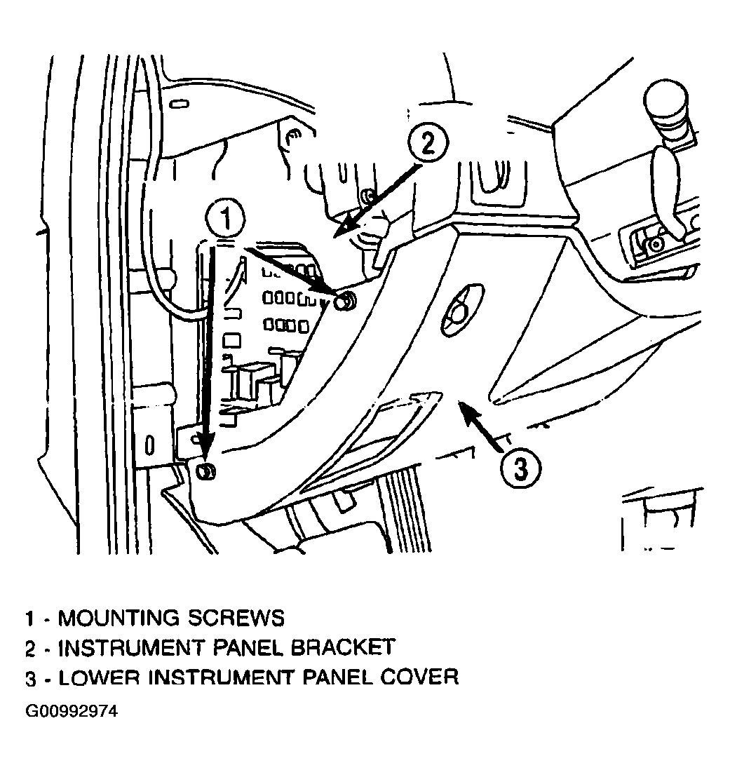 34. Install the two screws behind the fuse panel cover attaching the lower instrument panel cover to the instrument panel (Figure).