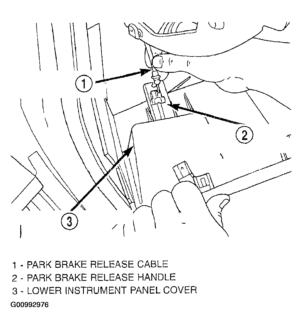 31. Install the parking brake release cable on the parking brake release handle in the lower instrument panel cover (Figure).
