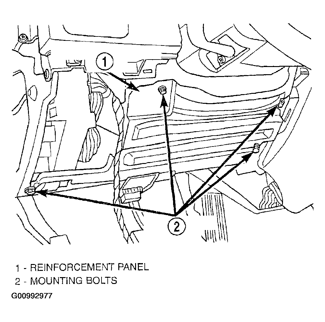 30. Install the reinforcement on the instrument panel (Figure). Install the four bolts mounting the reinforcement to the instrument panel.